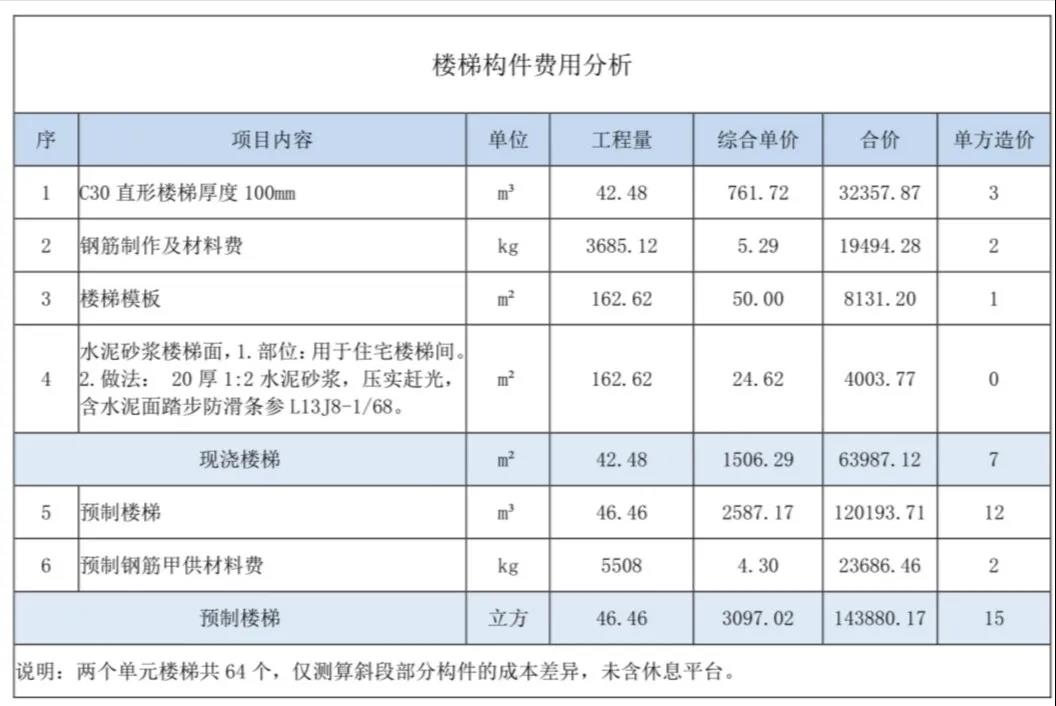 以下以其中某一棟高層住宅為例,依次分析樓梯、樓板、外墻、內(nèi)墻四個部品部件的成本增量。